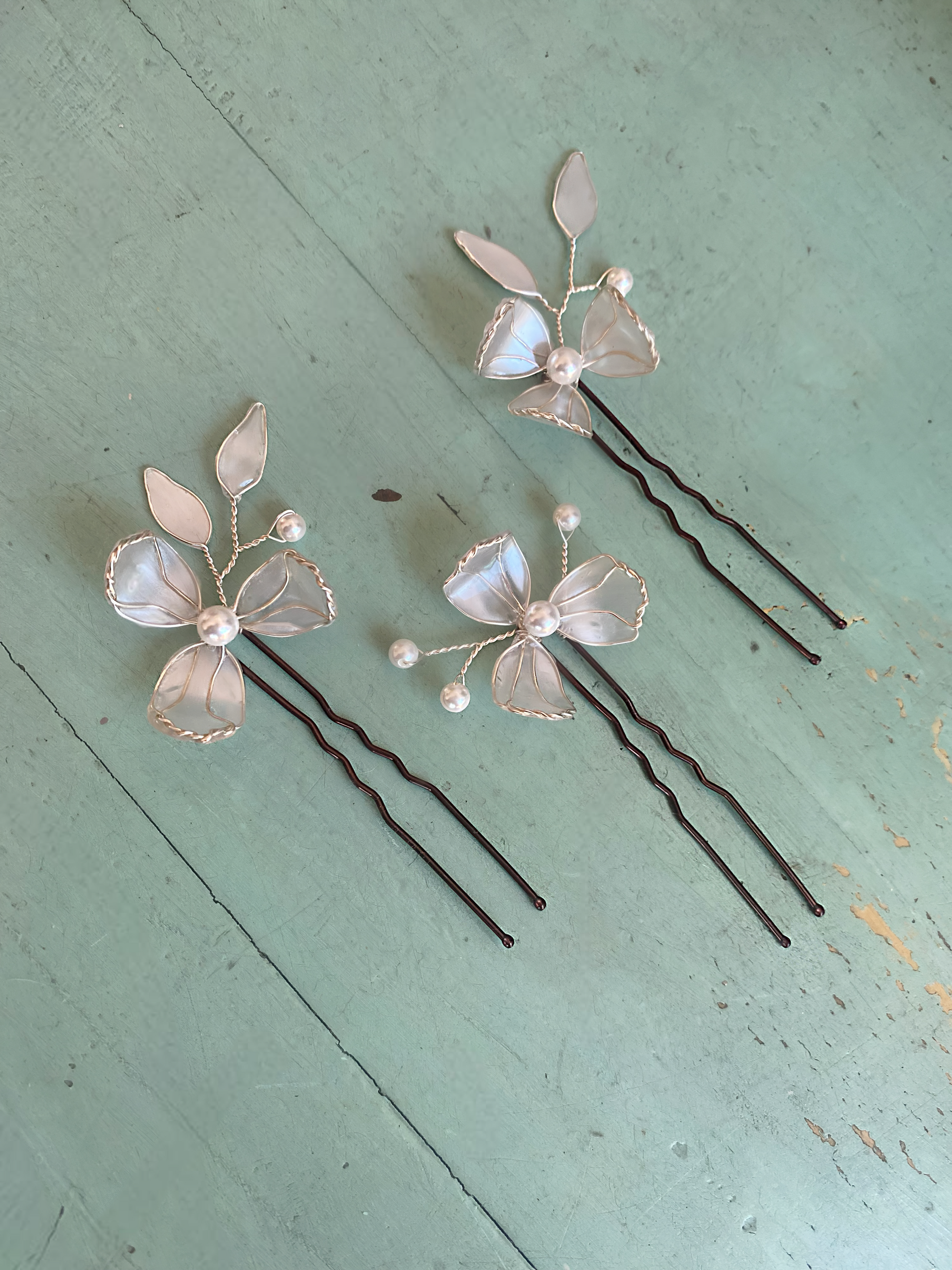 Set 3 pins con Flor nacarada de 2,5 cm y hojas nacaradas con perlas shell