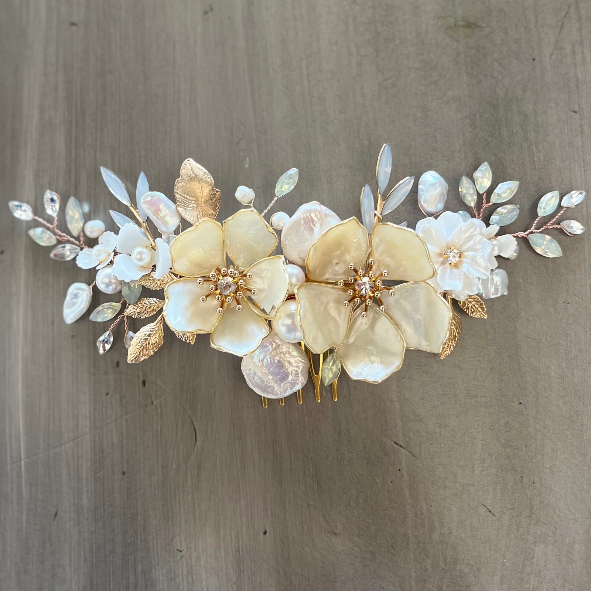 Tocado flores nacaradas y cristal de 16 cm con peineta